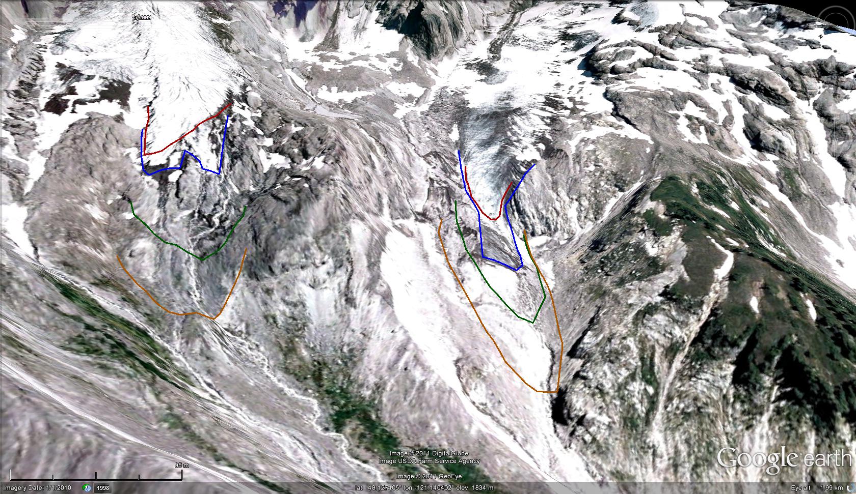 1984 USGS Map of Vista Glacier and 2015 LIDAR (WA DNR) of Vista Glacier. Red line is the 1984 terminus and yellow line the 2015 terminus location. Note lack of crevasses in lower half of glacier.