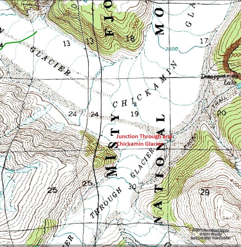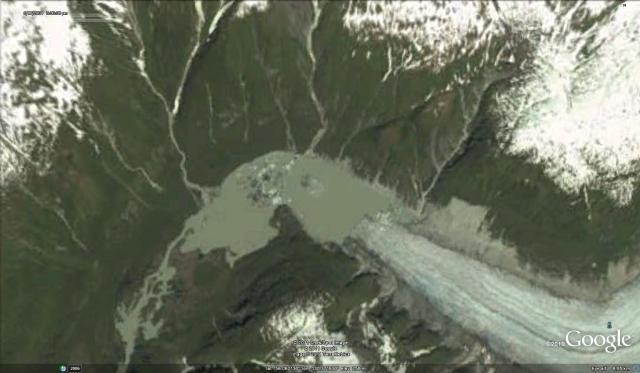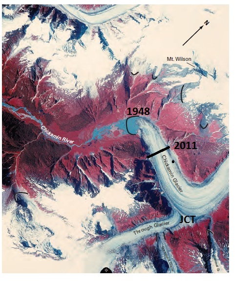 Shortly thereafter a lake began to form, and by 1979 a Landsat image indicates a lake that is 1300 meters long. A this point the Through Glacier is just barely in contact with Chickamin Glacier.