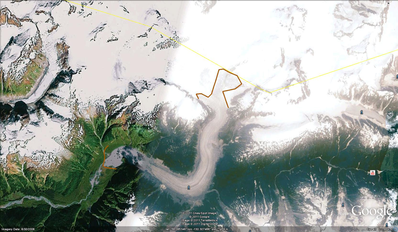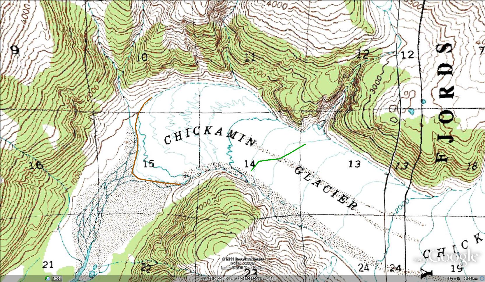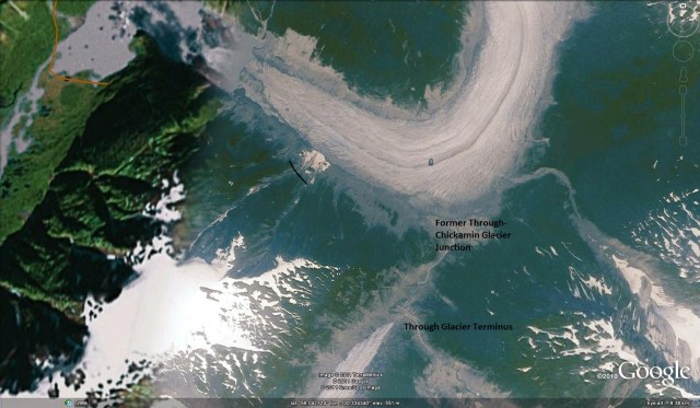 Just as impressive is the retreat of Through Glacier that now terminates 1500 meters from its former Junction with Chickamin Glacier. This separation and retreat has occurred during a period of higher snowlines in the region. The snowline of the glacier has averaged 1200 meters in recent years, 100 meters higher than before, and the summit of the glacier is at 2000 meters. The retreat and thinning of this glacier follow that of Sawyer Glacier, Gilkey Glacier and Lemon Creek Glacier