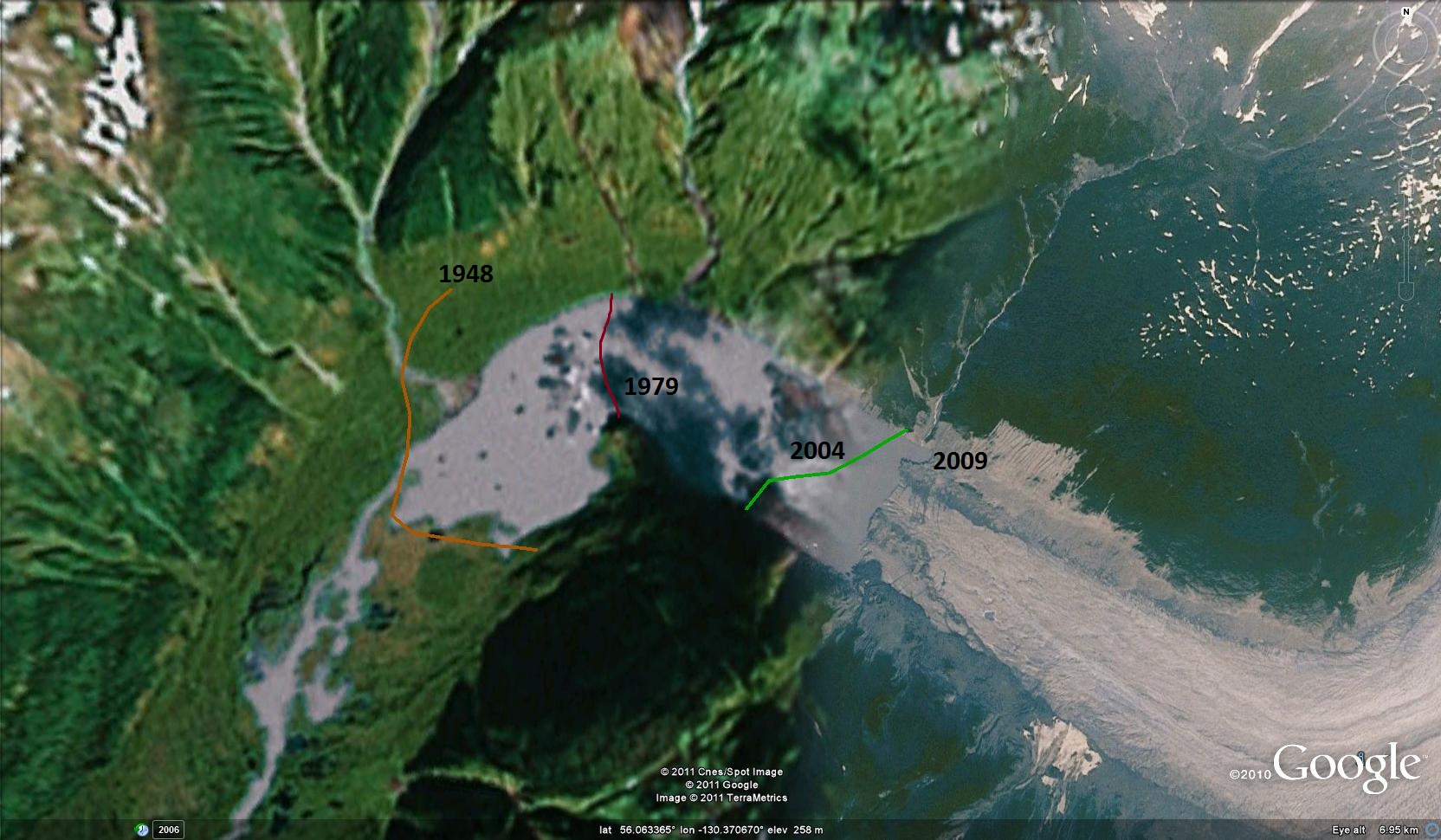 . By 2004 in an Ikonos image the glacier has retreated 1400 meters from the 1979 position, top image. This image is from the USGS and has been further annotated. In a 2009 Geoeye image the glacier has receded an additional 300 meters, 3000 meters since 1955.