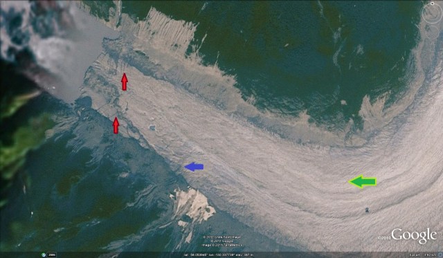 Melbern Glacier is following the same pattern as nearby Yakutat Glacier and Grand Plateau Glacier. The lower 3 km of the glacier appears stagnant. However, there is a moraine band 10m km above the terminus that has shifted down glacier 1000-1500 meters from 2001 to 2007 as seen in images from those dates below. The green line indicates the moraine position in 2007. This indicates significant flow at this point. Thus, it is evident that retreat will continue on Melbern Glacier, but should slow as either the lake basin is left behind, or the moraine band is approached