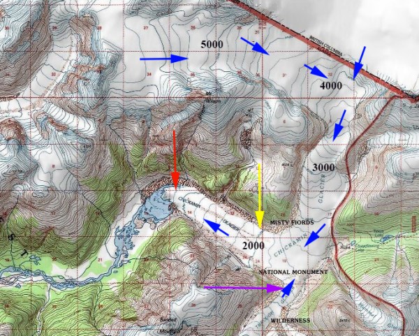 Chickamin Glacier, Alaska in 1994 and 2013 Landsat images indicating the 3.5 retreat and associated lake expansion. Red arrow is 1985 terminus location, yellow arrow is the 2018 terminus location, pink arrow is former junction area with Through Glacier. The purple dots indicate the snowline. Point 1 and 2 are locations of bedrock expansion above the equilibrium line altitude.