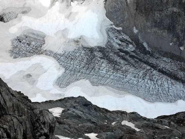 In the ensuing 34 years the glacier has continued to retreat up the slope and is notably thinner coming down the final steep slope. The glacier ends at the termination of the ridge on the right of the glacier. The glacier has retreated 420 m since 1972.