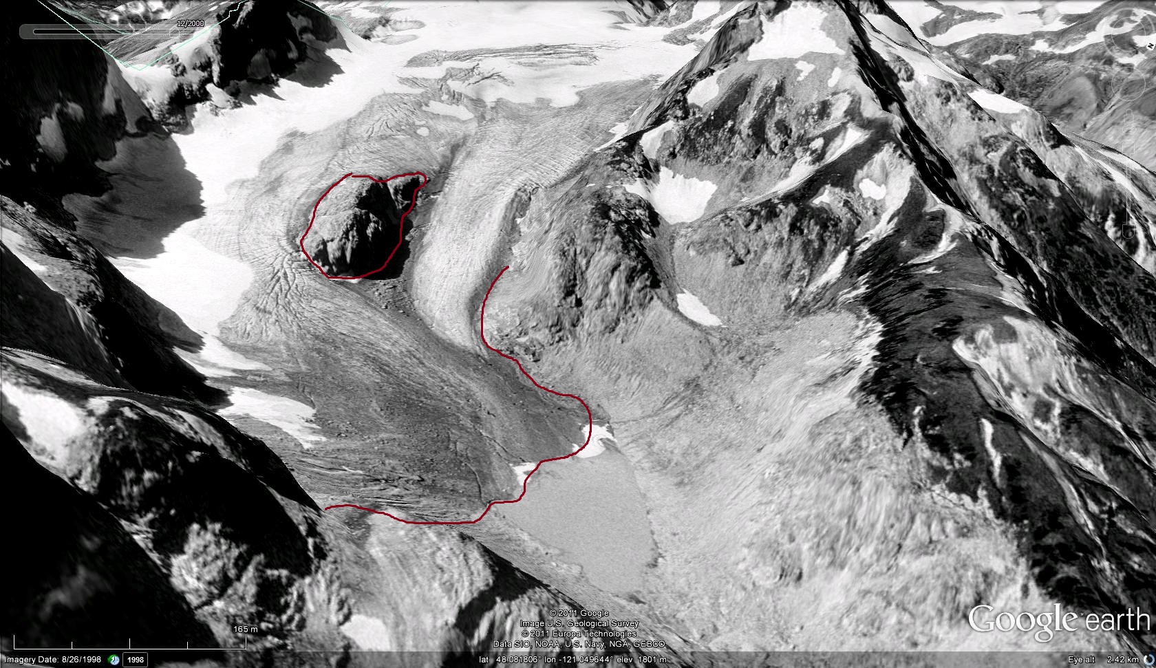 Indicating this glacier will retreat at least to the base of this rock knob, which will then no longer be a nunatak. A comparison of Google Earth Imagery from 1998 and 2009 illustrate the appearance of numerous new bedrock knobs in the area where there was an icefall in 1995.