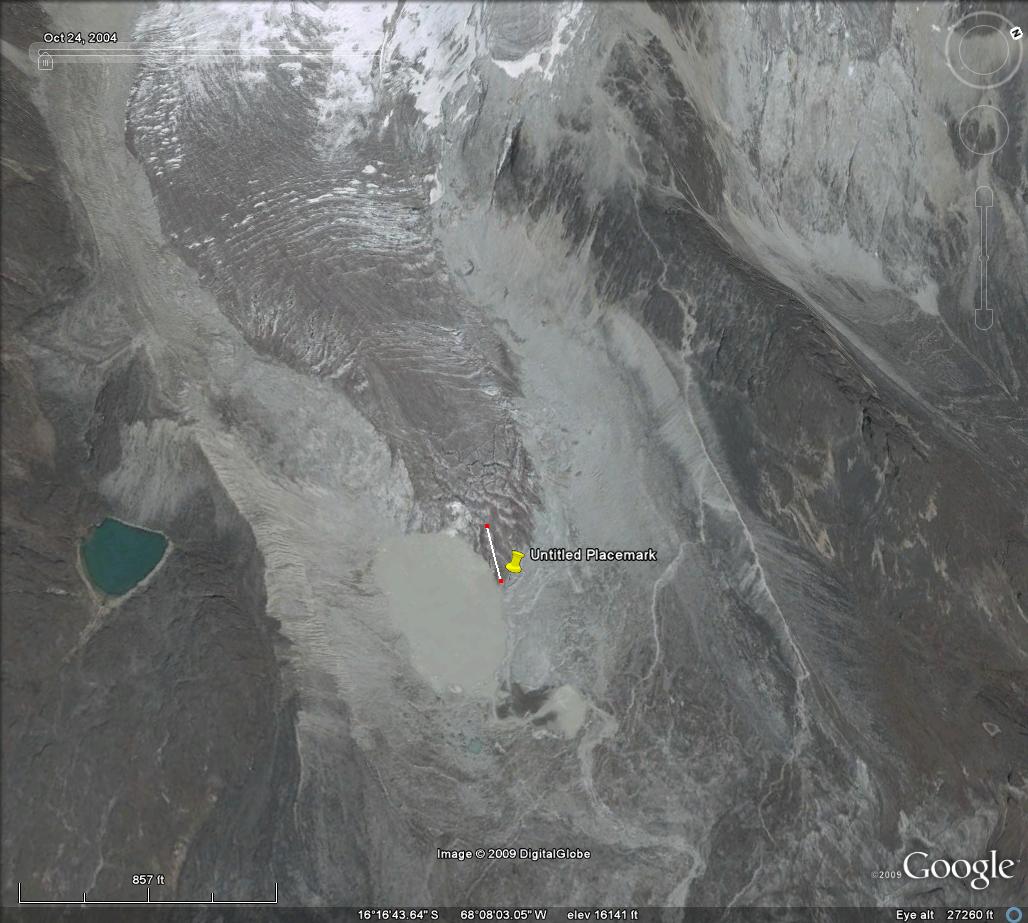 A Google Earth image from 2005 of the terminus region indicates that the lower 700 meters of the current glacier is thin and lacks any crevasses indicating it nearly stagnant. By 2012 the terminus had retreated 80-90 m from 2005, yellow arrow indicates 2012 terminus, pink arrow 2005. This is in contrast to an active front, which indicates a healthy glacier, that would be thick and crevassed. A healthy glacier can still be retreating, the front was active at the time of my first visit to the glacier in 1984. The glacier is still 3.5 kilometers long and even after the retreat the glacier will still have a substantial length and area.