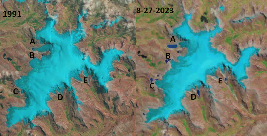 The series of lakes that began to develop after 1991 at the margin of the QIC have expanded, and now are separating from the retreating ice margin.