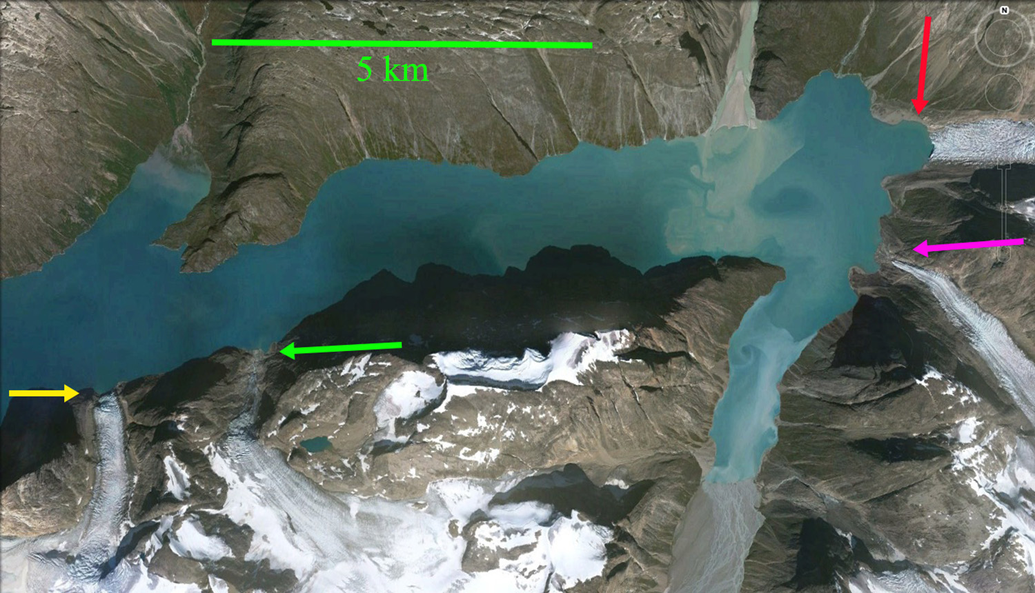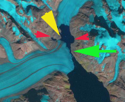 At the AGU 2015 meeting a clear change from 15 years ago is the interdisciplinary nature of most research featured in most sessions. In the glacier sessions there is physical oceanography, biology, climatology etc.to add in. I will examine a SW Greenland Fjord, Alangordlia to illustrate this. In 1987 Landsat image there are four glaciers reaching tidewater in the fjord and two significant glacial fed streams contributing plumes of sediment. By 2015 two of the glaciers, green arrow and pink arrow, have retreated from contact with the fjord. The glacier at the yellow arrow will lose contact with the fjord quite soon, and the glacier at the red arrow has reduced width of contact and will retreat from the fjord in the near future. A closeup using Google Earth from 2010 illustrates the terminus of each glacier, below.