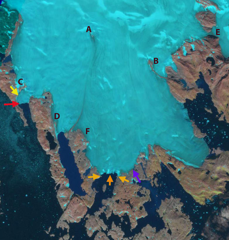Bussemand Gletscher in East Greenland has a mixed tidewater and land based terminus. This glacier is 50 km west of Tasiilaq and just west of Nattivit Kangertivat Fjord. In this post we compare Landsat imagery from 2000 and 2012 to determine the response of this glacier to recent climate change. Espen Olsen provided the base map below and noted that Bussemand translates to bogey man.. The first two images below are a 2000 and 2012 Landsat image. On these two images the terminus in three locations is noted. The main tidewater terminus at the orange arrows is exposing a new island or peninsula as it retreats. Two orange arrows point to small prominence’s on the side of the inlet that the glacier almost reached in 2000 and has retreated 800 m from on the west side and 400 m on the east side by 2012. At the purple arrow a new proglacial lake has formed and the terminus retreated 400 m from 2000 to 2012. At the secondary tidewater terminus the glacier has retreated 700 m from the red arrow to the yellow arrow. There are also a series of letters A-F at the same location in each image each highlighting changes. Point A denotes the expansion of a nunatak within the ice. Point B indicates the expansion of a nunatak and the lateral moraine extending from the nunatak; Point C is where an area of bedrock at the margin of the western tidewater terminus has doubled in size. Point D was a small outcrop at the edge of the glacier and is now a developing peninsula. Point E was a narrow connection to the neighboring Apuseerseerpia Glacier that is now bedrock. Point F is a location where several new bedrock knobs have emerged at the surface of the glacier. Collectively they indicate the thinning of the glacier across its entire front and several kilometers inland of the front.