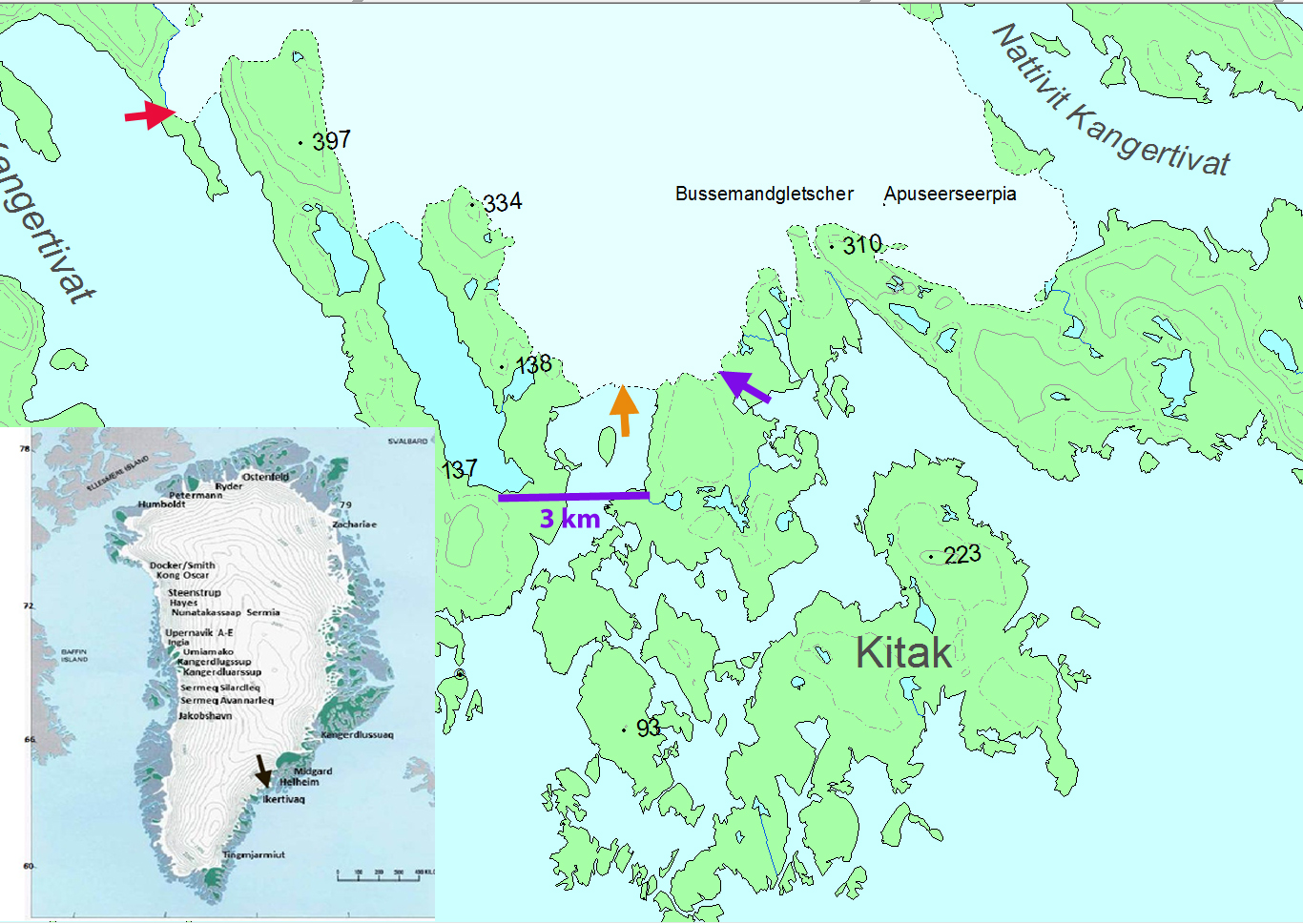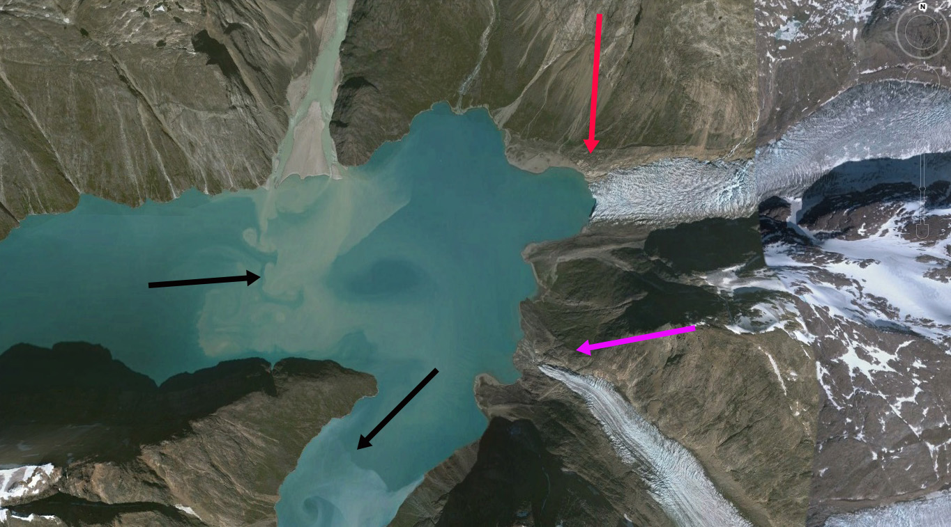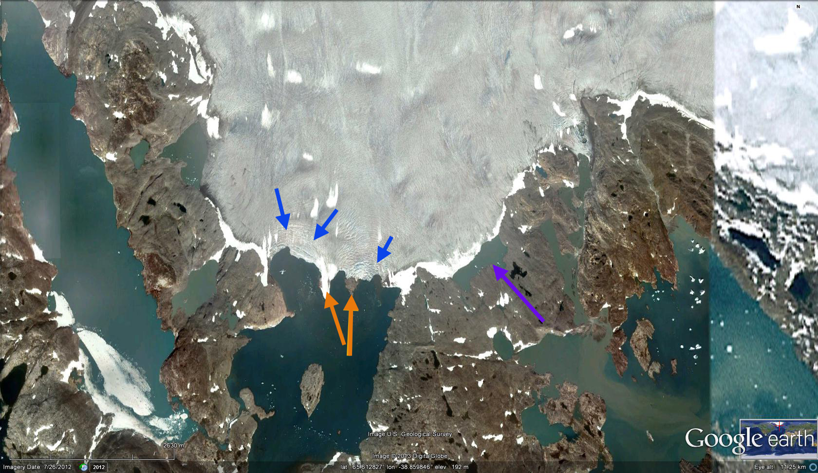 Below is a closeup of the terminus the two active calving embayments are indicated with blue arrows. As these narrow and the water depth drops, calving will be reduced. However, it is not clear that there is not embayment inland of this point where the proglacial lake is developing at the purple arrow. Note the channels for example between Kitak Island and the mainland in the first image. The retreat of this glacier follows that of other glaciers in the region big and small. Mernild et al (2012) noted the widespread retreat of many small glaciers including Mittivakkat. Larger glaciers were detailed by Bjork et al (2012), for example Apuserajik and Thrym.