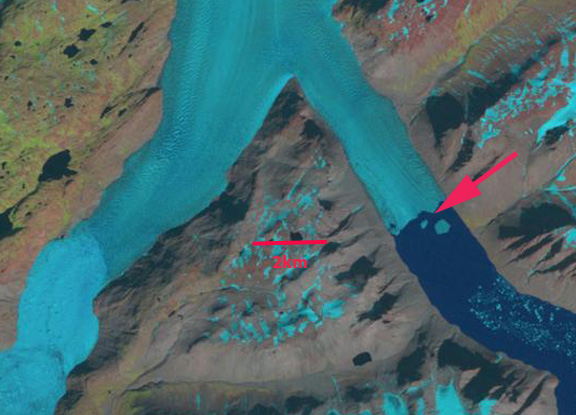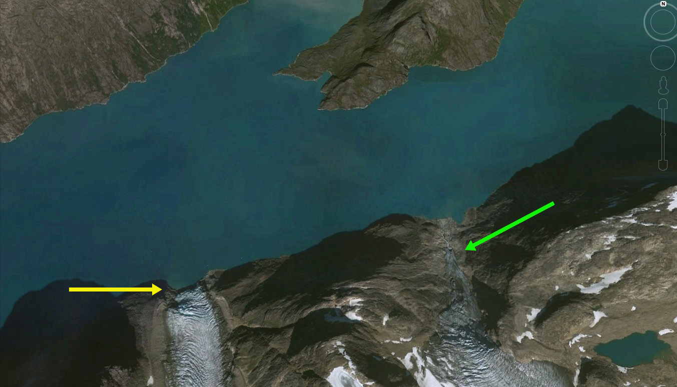Google Earth imagery of the region. illustrating the loss of fjord connection after 2009.