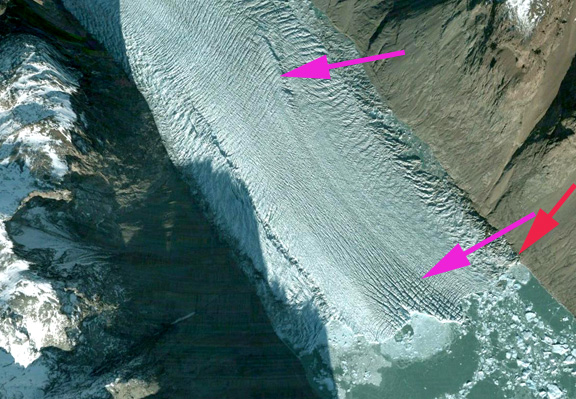 Apostelens Glacier in Norrearm Fjord Google Earth comparison from 2004 and 2012. Red arrows are the 2004 terminus location, and yellow arrows the 2012 terminus location. Note ogives in 2004 and loss of them in 2012.