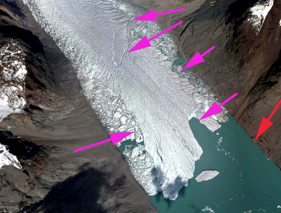 A series of images from 1993 to 2008 indicate limited terminus change, the red arrow indicates the 1993 terminus position on each image. The main change was the minor retreat on the western side of the terminus between 1993 and 1997, where a 600 m wide and 600 m long area was lost. After 2010 the glacier retreated 750 m by 2014. However, in 2014 it is clear that the lower 3 km of the terminus is disintegrating. The disintegration is evident at the pink arrows, with both rifts and iceberg melange sections evident. The Google Earth imagery from 2005 and 2013 indicate a vast change in the character of this terminus reach. In 2005 the terminus is still at the same location, red arrow. The pink arrows indicate crevassing that indicates rapid glacier flow, there is no significant rifting or melange at that time. By 2013 the glacier has retreated from the red arrow at the 1993-2010 terminus position. More importantly each pink arrow indicates an substantial rift or ice melange. The glacier tongue is no longer in contact with the valley walls in its last two kilometers, three kilometers on the east side. There is also a large rift two kilometers from the ice front, indicating a location where the glacier will separate. This rift does penetrate to the water level. The retreat of this glacier is similar to that of Narssap Sermia and Qaleriq Glacier. The rifting leading to calving is what was observed on Petermann Glacier.