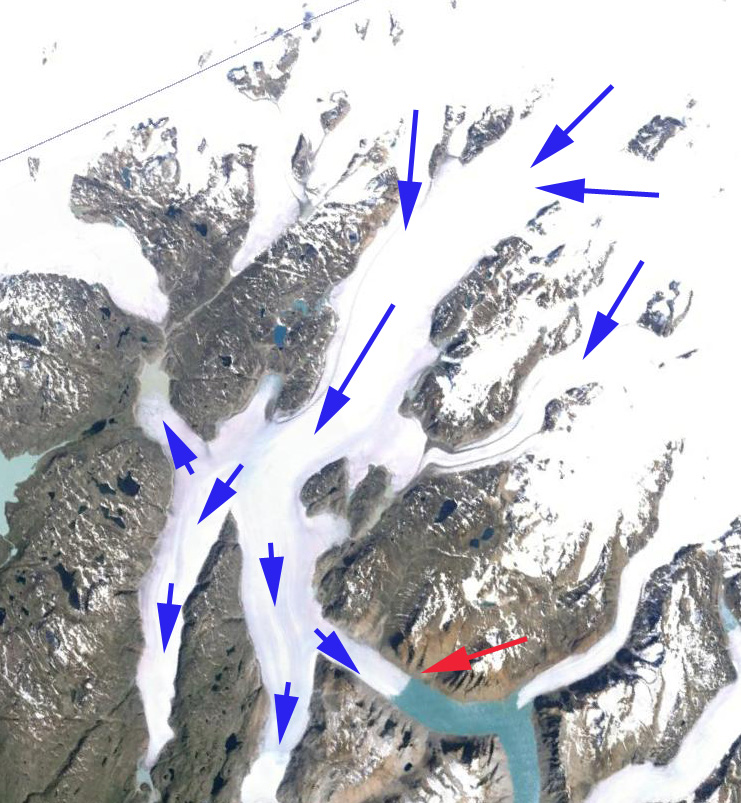 This is an index of posts on the response of specific Greenland glaciers to climate change. In the 1980’s when I first worked on Jakobshavn Isbrae, Greenland there was not much research occurring on the glaciers. Today in response to the dynamic changes discussed below and glacier by glacier in the index links, Greenland is the focus of numerous extensive, ongoing and important research projects. In 2015 scientists are gearing up for the main field season to better identify and understand the current and future response of this critical ice sheet. At the time of each post I reference the specific research relevant, the posts are from 2009-2014. In the intervening period new research has made some further advances, and I will endeavor to update each post to reflect this. The posts illustrate the significant response of Greenland Glaciers to climate change regardless of what type of glacier they are. The Polar Portal has developed an online viewer of change on selected glaciers. Each year the Arctic Report Card updates annual observations of Greenland Ice Sheet Change. The posts have benefitted from the insights and observations of Espen Olsen. Any questions about a glacier or suggestions on a glacier to look at let me know.