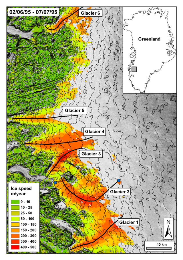 Fig 3. An example of a two-dimensional ice-velocity map of the study area in southwest Greenland Inland terminating glaciers velocities (Sundal et al, 2011).