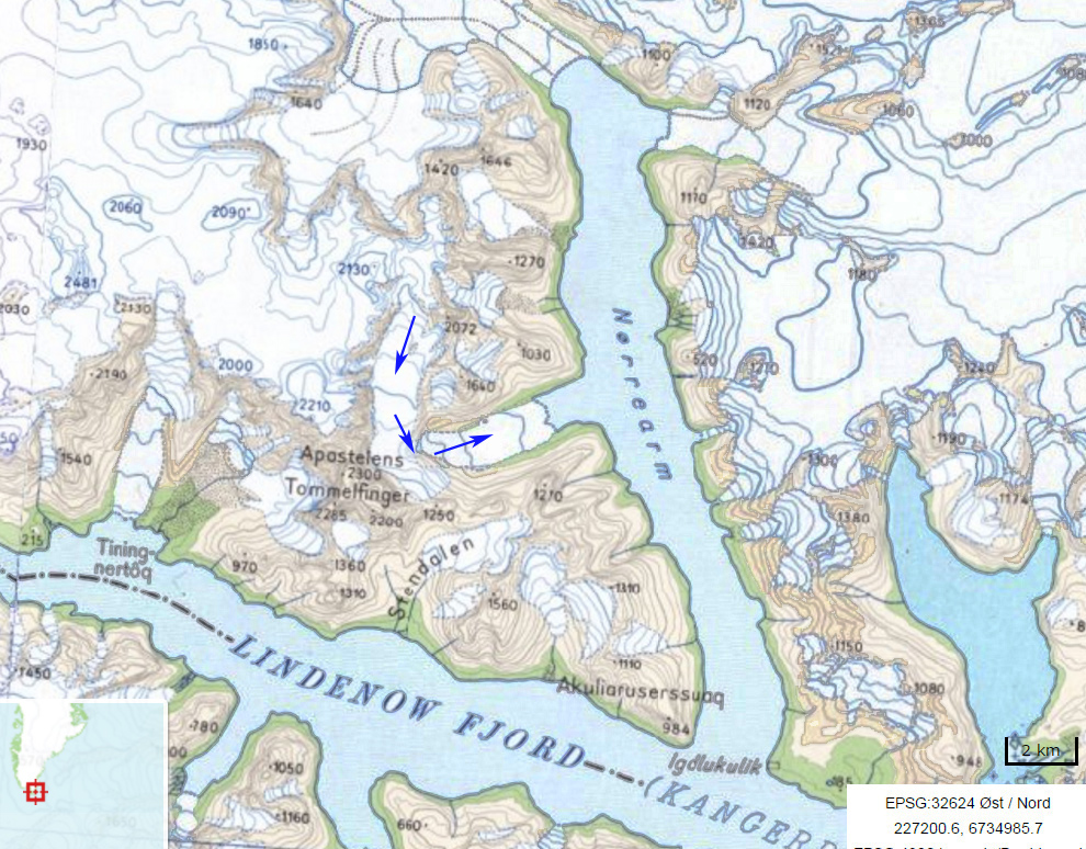 Map of the Norrearm Fjord region and Apostelens Glacier, with blue arrows indicating flow.