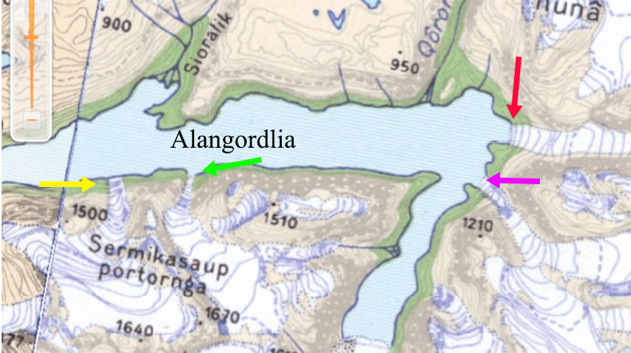 2010 Google Earth of glaciers on the south side of Alangordlia 2010 Google Earth of glaciers at the east end of Alangordlia Topographic map of region from NunaGIS