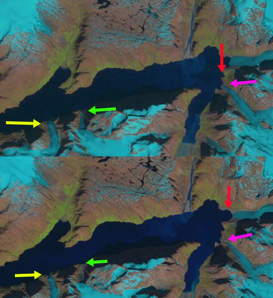 Apostelens Glacier in Norrearm Fjord Landsat comparison from 1999 to 2016. Red arrows are the 1999 terminus location, yellow arrows the 2016 terminus location and purple arrows indicate an expanding bedrock ridge.
