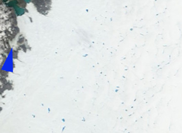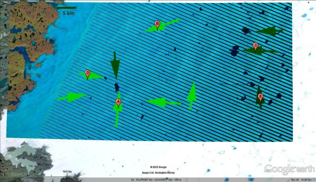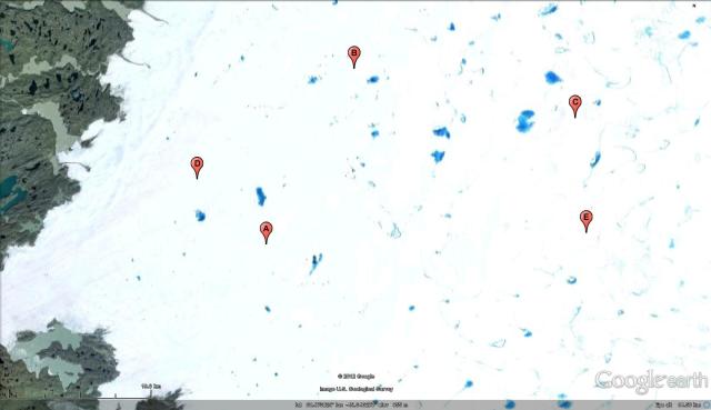 Below is a sequence illustrating the development of lakes from June 2012 using MODIS and Landsat imagery. The Landsat images are from June 2 and June 19 the arrows and letters indicating specific locations. Note the shift in the main lake formation area from the light green to the dark green arrows. The light green arrows are below 1000 m and the dark green from 1200 to 1300 m, except for lake A which has persisted. Most of the lakes below 1000 m from June 2 are gone by June 19. The same area is also seen in 2005 with some of the same lakes filled The MODIS images are from June 2 and June 30 and again indicate the shift in location of the supraglacial lakes. The lakes evident below 1000 m are almost all gone by the June, and few lakes exist except above 1200 meters, indicating an earlier melt cycle this year. The location of Tiningnilik Lake is also shown, and it has filled somewhat during the month, being the recipient of some of the water from lake drainage events.