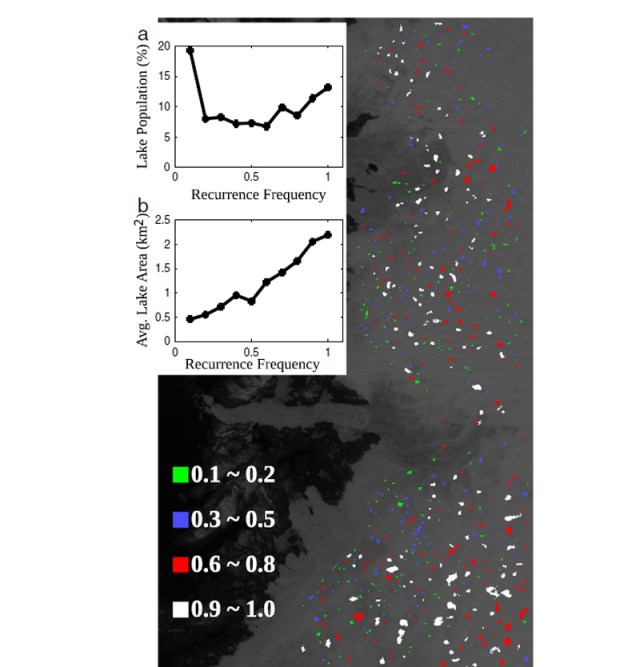 . Liang et al (2012) provide an excellent view of how often the lakes occupy the same location, it is evident in their figure that most of the large lakes reform the majority of the years, red and white lakes form more than 60 % of the years. This tendency is what Box and Ski (2007) noted that many lakes refill the same topographic depression each year. This topographic depression is the result of flow dynamics of the ice sheet in some cases resulting from bed topogpaphic changes.