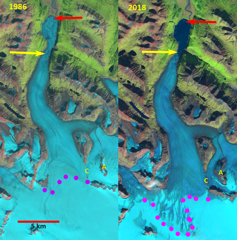 In the 1958 USGS map from there is no lake evident at the terminus of the glacier. The lower 2 km of the glacier is nearly flat. By 1986 the flat terminus was breaking up with icebergs filling the lake. By 2002 the glacier had retreated 4 km generating a lake with an area of 6.2 square kilometers. The snowline in 2002 was at 1200 m. The glacier retreated 300 m from 2002 to 2018. From July 2018 to Sept. 2018 the snowline rose from 1050 m to 1300 m. Though retreat has been slow since 2002 upglacier thinning has been substantial At Point A and C from 1986 to 2018 and at Point A and B from 2002-2018. This will drive additional retreat. The retreat rate should be more in line with that of the neighboring Harris Glacier.