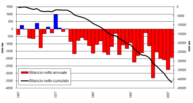 In a series of Landsat images from 1999, 2001 and 2016 and a picture from Lago Sabbione in 2007, the retreat from the lake is evident. The 1988 terminus in an image below is indicated by a red arrow, the 2010 terminus by a yellow arrow, the new outcrop in the midst of the glacier by a magenta arrow. The retreat from 1988 to 1999 is 240 m, there is no rock outcrops emerging in 1999 or 2001. The glacier is 2.5 km long beginning at 3200 m and terminating at 2550 m in 1999. By 2007 image below the rock outcrop has become apparent. By 2016 the glacier has retreated 950 m from the lake and 700 m since 1999 and is now less than 2 km long. The outcrop in the glacier center is 200 m wide. Of greater concern for the future of the glacier than retreat is the emergence of rock outcrops in the midst of the middle portion of the glacier, and smaller ones on the upper glacier. In 2016 the glacier only has 15% snow cover in this late August image, much less than the 50-60% needed for equilibrium balance. This indicates a glacier that is not in equilibrium lacks a persistent accumulation zone, indicating it will not survive current climate (Pelto, 2010). In the most recent survey published by the Italian Glacier Commission indicates all glaciers in this region of Italy retreated in 2015.