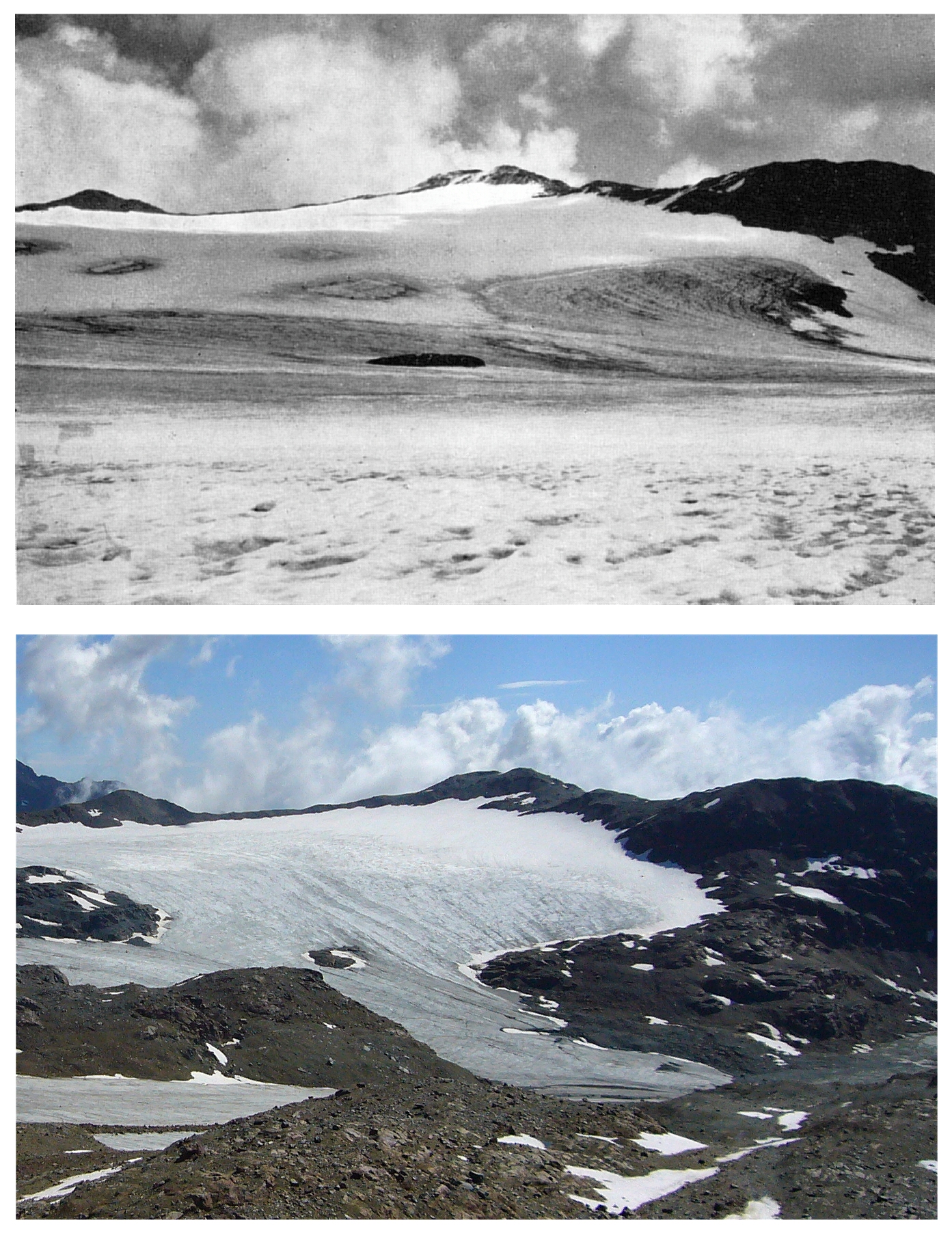 Sabbione Glacier is on the Swiss-Itlaian border. The glacier drains into Lago Sabbione an artificial lake that in turn drains into Lago Morasco, which is a 29MW hydropower facility. The lake also has good fishing. This glacier in 1988 reached the shore of Lago Sabbione. Today glacier retreat has changed its nature dramatically. It is not as close to disappearance as nearby Cavagnoli Glacier or Careser Glacier. Huss and Fischer (2016) indicate that the majority of the small alpine glaciers, less than 0.5 square kilometers will disappear in the next 25 years.