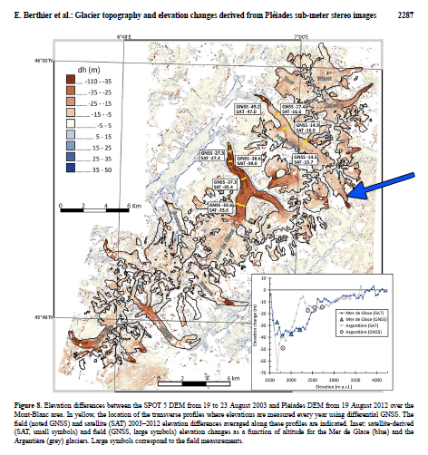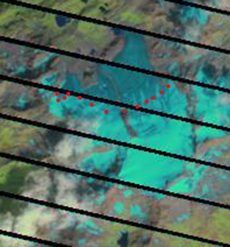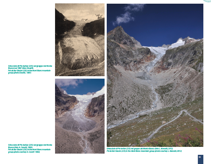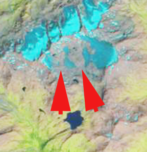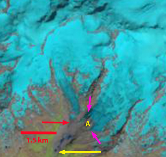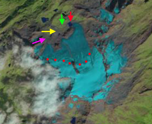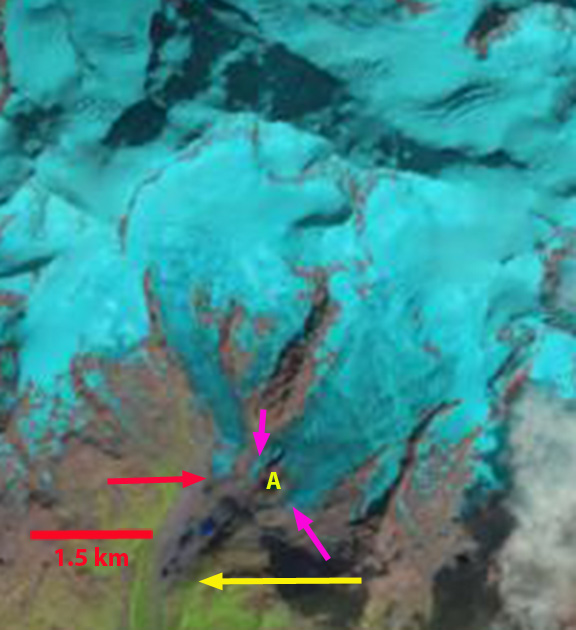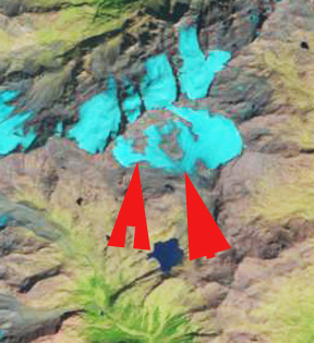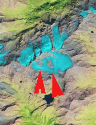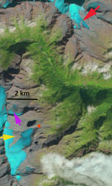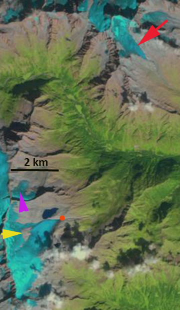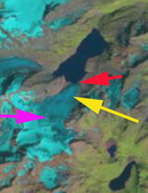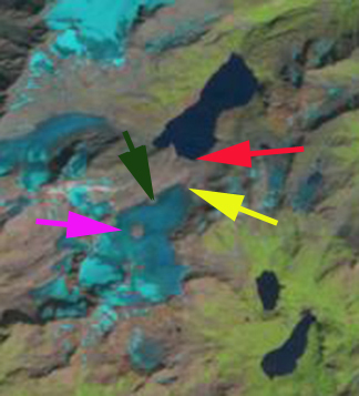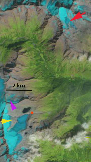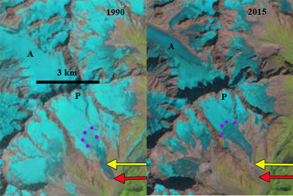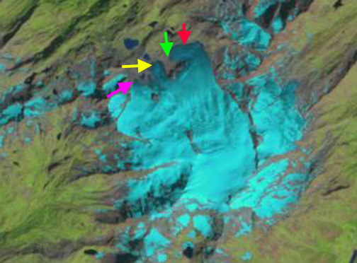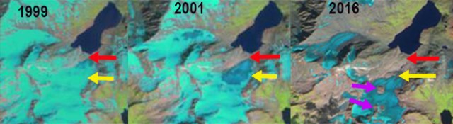 Sabbione Glacier in 1999, 2001 and 2016 Landsat images. Red arrow is 1999 terminus location, red arrow the 2016 terminus location and the purple area new rock outcrops emerging in the midst of the glacier.