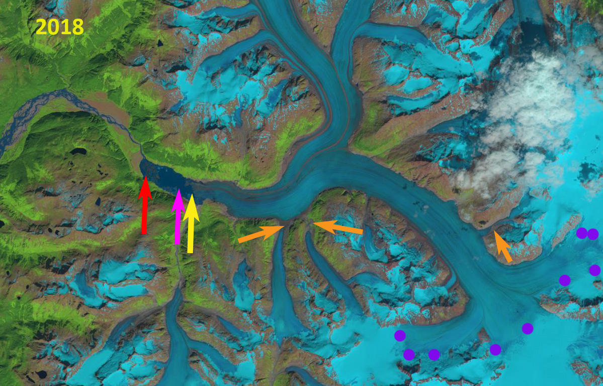 East Twin Glacier terminus change from 1984-2021 in Landsat images. Red arrow is the 1984 terminus, yellow arrow the 2021 terminus.