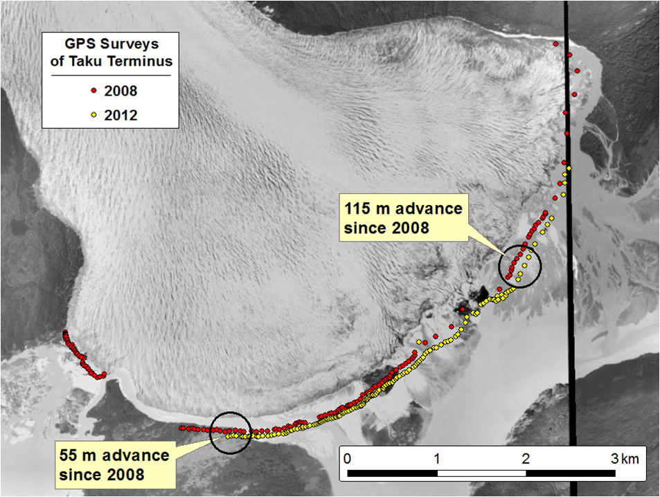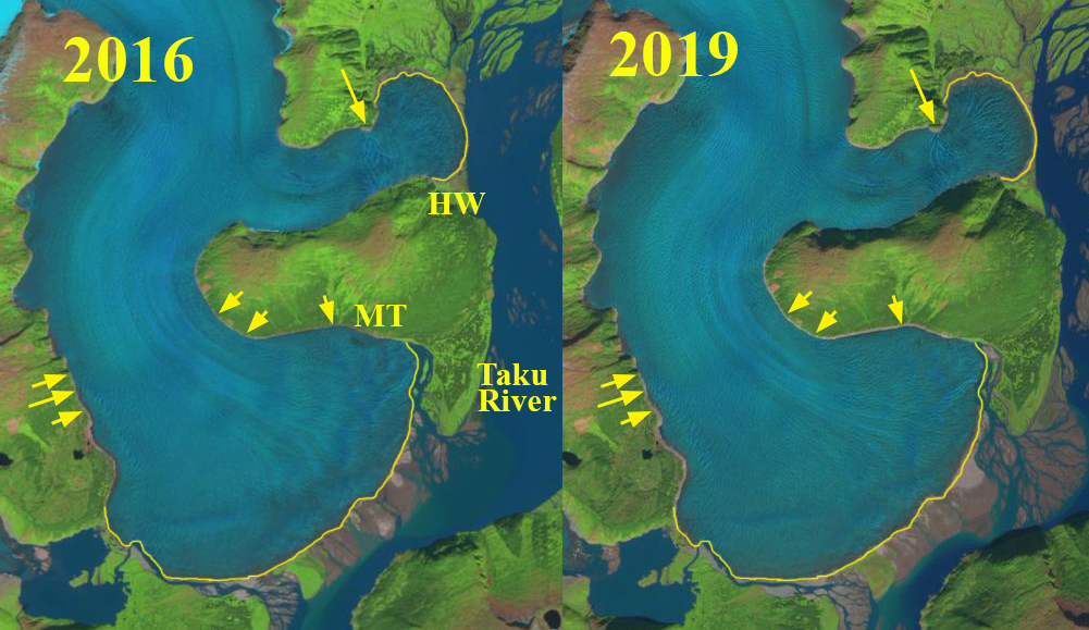 Field Glacier terminus in Landsat images from 2006 and 2009, red line is terminus with orange arrows indicating fringing lake development.