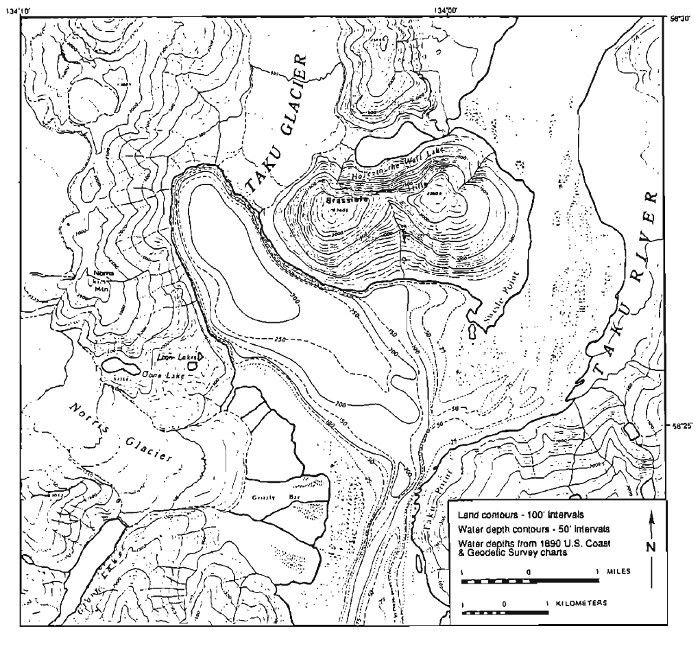 In 1984 the glacier began from the high ice region above 1800 meters, with two main branches joining at Point A and one significant tributary joining from the northern branch at Point B. There are icefalls near the snowline at 1350 meters on both the southern branch and the tributary entering at Point B. In 1984 the glacier descended the valley ending at 100 meters on the margin of an outwash plain. The meltwater feeds the Lace River which flows into Berners Bay. This post focusses on the changes from 1984-2021 using primarily Landsat imagery.