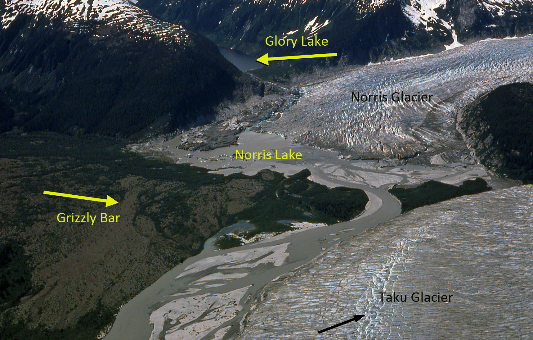 In 1984 the glacier began from the high ice region above 1800 meters, with two main branches joining at Point A and one significant tributary joining from the northern branch at Point B. There are icefalls near the snowline at 1350 meters on both the southern branch and the tributary entering at Point B. In 1984 the glacier descended the valley ending at 100 meters on the margin of an outwash plain. The meltwater feeds the Lace River which flows into Berners Bay. This post focusses on the changes from 1984-2021 using primarily Landsat imagery.