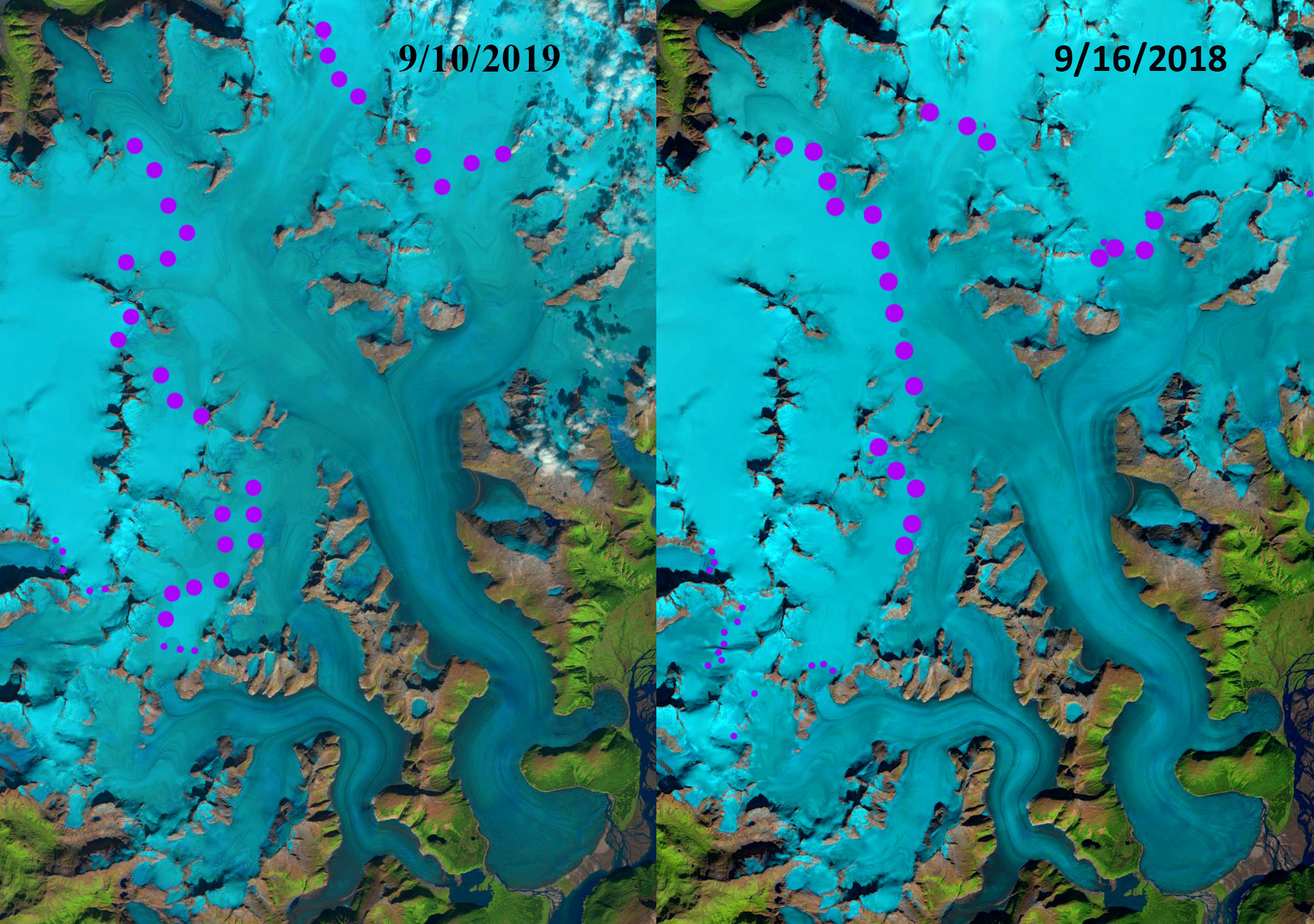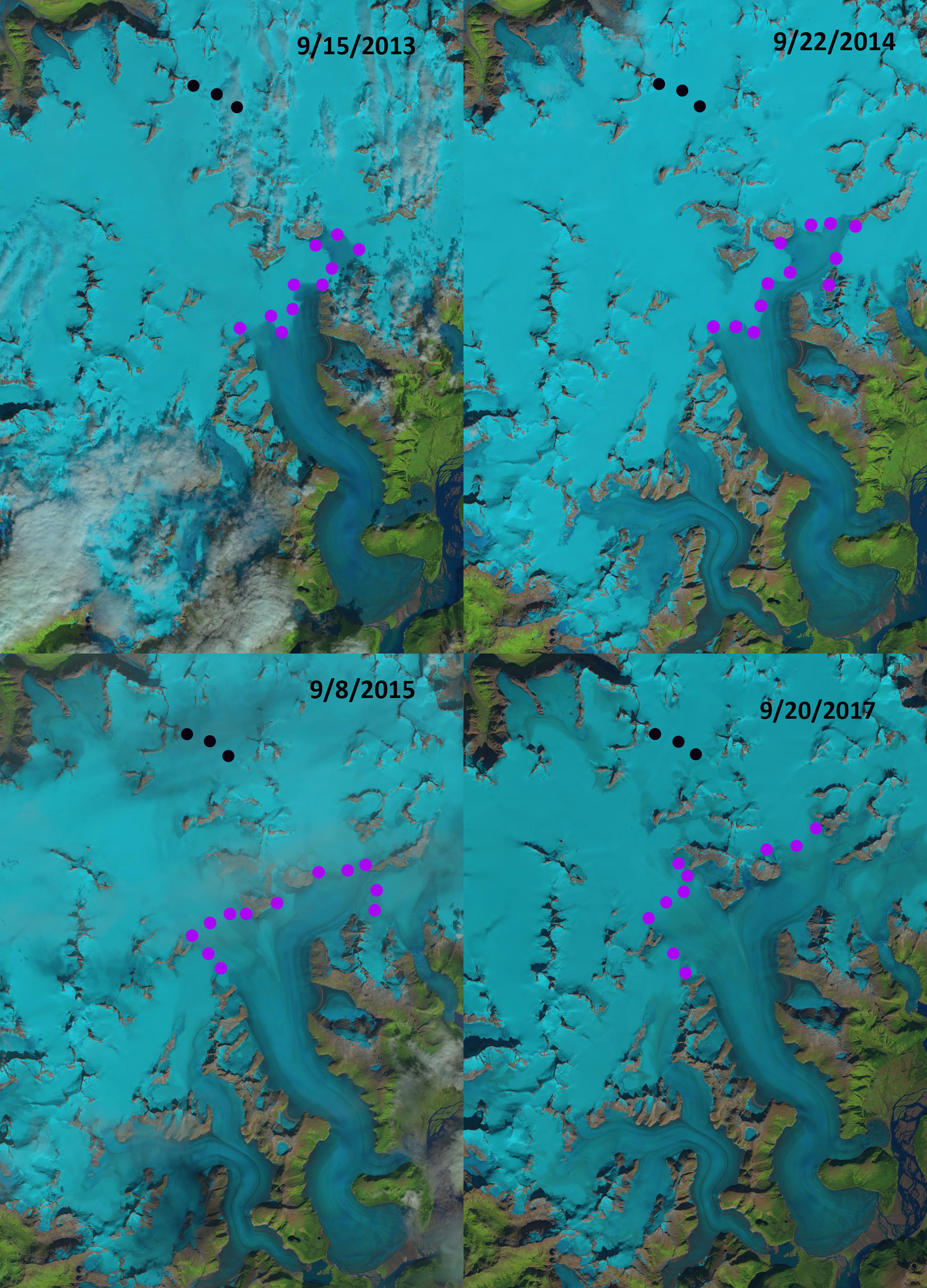 Field Glacier terminus in Landsat images from 1984 and 2013, dots indicate terminus, with pink arrows in 2013 indicating where marginal lakes have developed.
