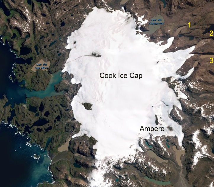Digital Globe image of the Cook Ice Cap, with the main outlet, Ampere Glacier and the three glaciers examined here 1-3.