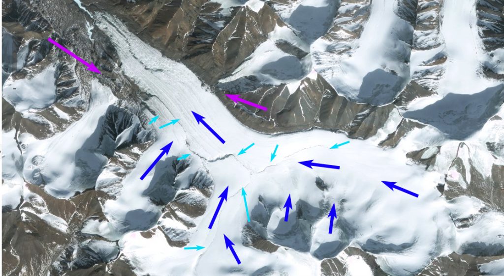 HPS-12 Glacier in 1985 and 2017 Landsat images. The red arrow indicates 1985 terminus, yellow arrows the 2017 terminus, purple dots the snowline and 1-4 are tributaries. By 2017 all tributaries have detached and the glacier has retreated 13 km.
