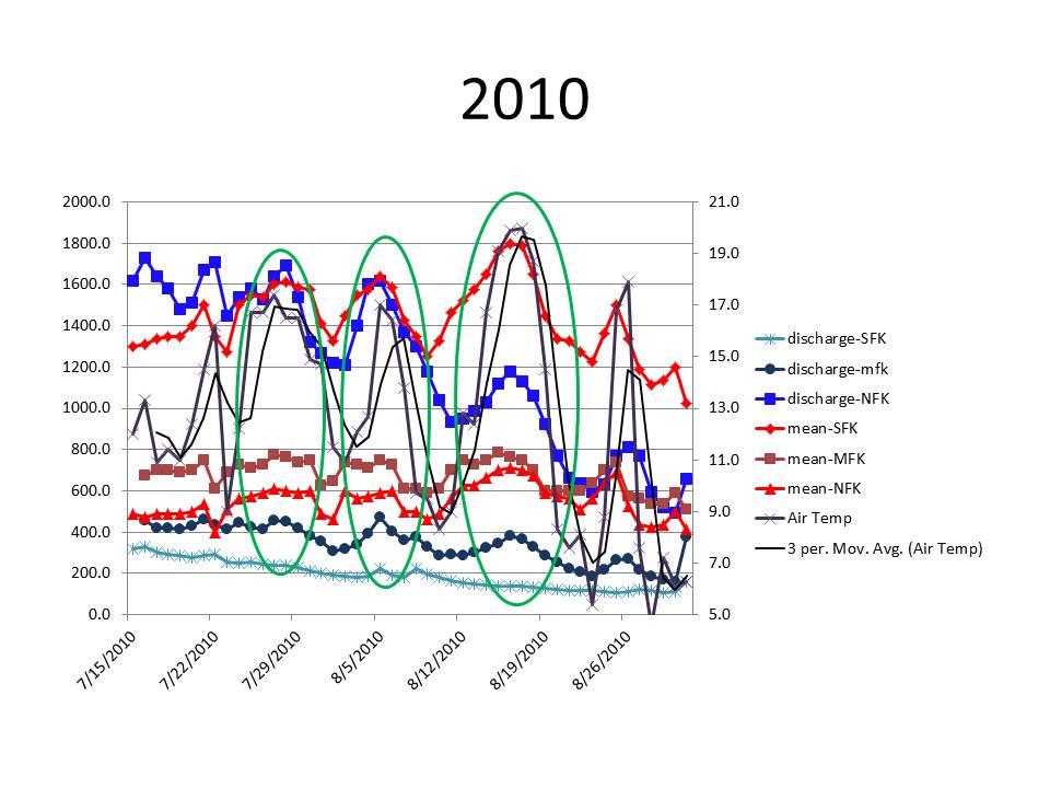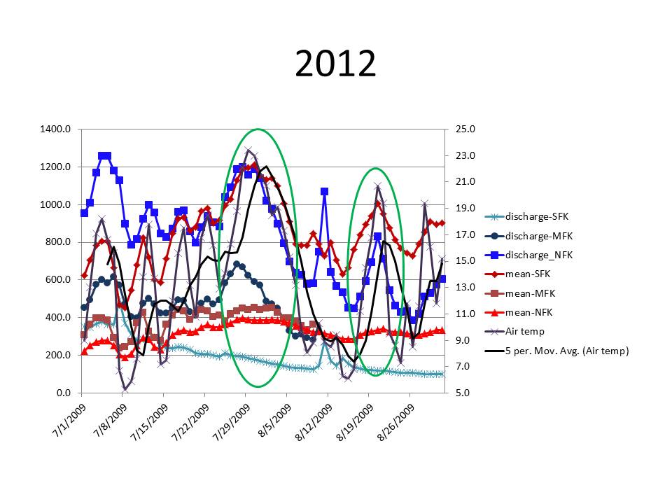 For water temperature, an increase of 2° C is the threshold of significance used for response to warm weather events. In each the North Fork and Middle Fork, 2 of 12 events exceeded this threshold, and for the South Fork 12 of 12 events exceeded this threshold, each event is a green ellipse on the charts below. Warm weather events consistently generate a significant increase in stream water temperature only in the non-glaciated South Fork Basin. During 6 of these 12 warm events, runoff measurements below Sholes Glacier and ablation measurements on Sholes and Easton Glacier indicate daily ablation ranging from 0.05-0.06 meters per day, which for the North Fork currently yields 9.5-11 m3/second. This is 40-50% of the August mean discharge of 24 m3/second, despite glaciers only covering 6% of the watershed. Increased glacier discharge largely offset the impact of increased air temperature on stream water temperature during the warm weather events. In the charts below note the red line with diamond markers that is the South Fork stream temperature and the top brightest blue line that is North Fork discharge and what happens during the warm events, green ellipses. Also note the South Fork discharge bottom blue line does not respond nor does the North Fork stream temperature red line with triangles.