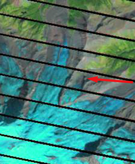 1994 Google Earth Image, red is 2012 terminus position, green the 1994 terminus position