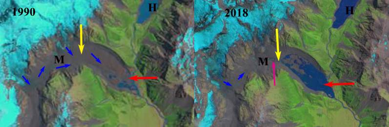 Mueller Glacier (M) in a Landsat image from 1990 and a Sentinel image from 2018. Red arrow is 1990 terminus, yellow arrow 2018 terminus, blue arrow glacier flow, and pink arrow in 2018 ablation valley cut into glacier.