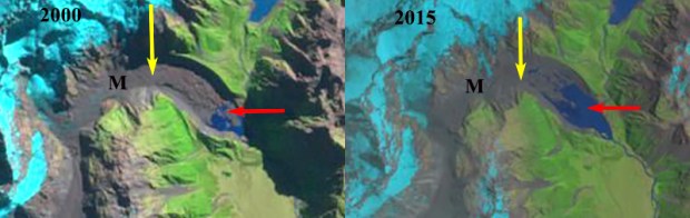 Mueller Glacier (M) in a Landsat image from 2000 and 2015. Red arrow is 1990 terminus, and yellow arrow 2018 terminus.