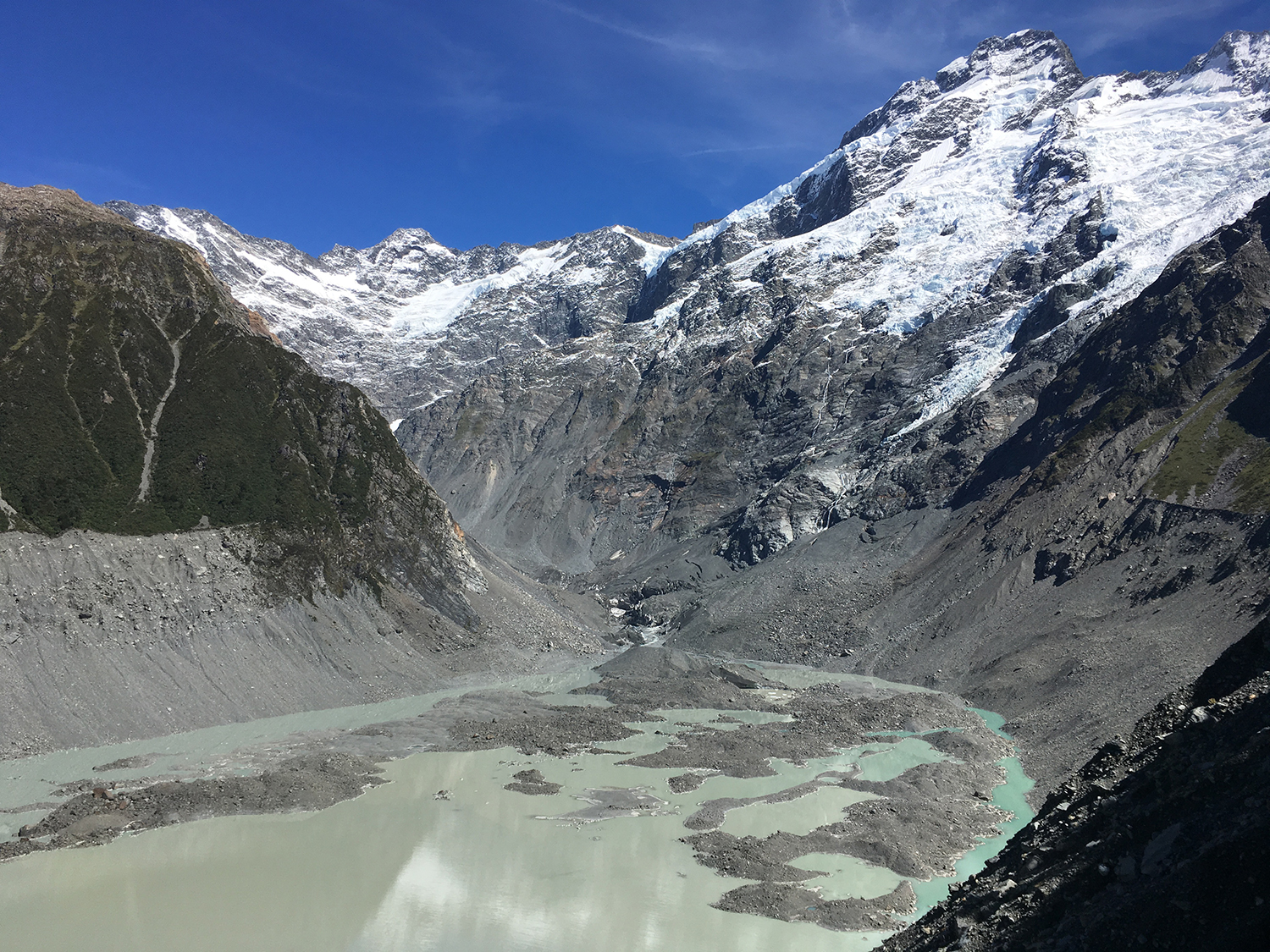 Field work images from Jill Pelto looking across Mueller Lake towards Hooker Lake and Mt. Cook. Some remnant ice is visible.