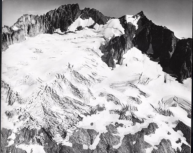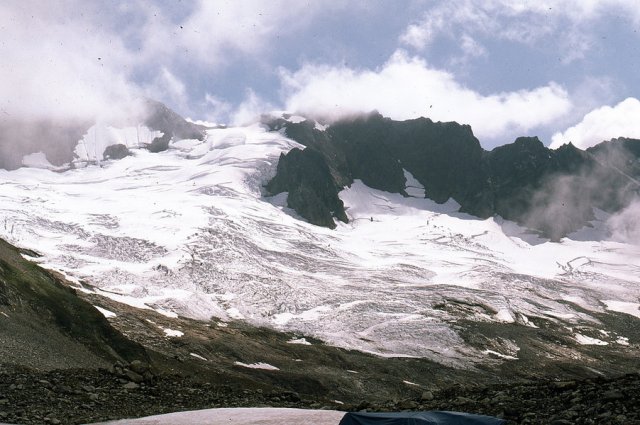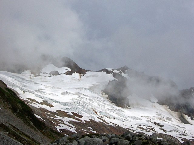 Easton Glacier extends from the terminus at 5600 feet to the slopes near Sherman Crater at 9000 feet. Each summer since 1990 NCGCP has measured the mass balance of this glacier. View
