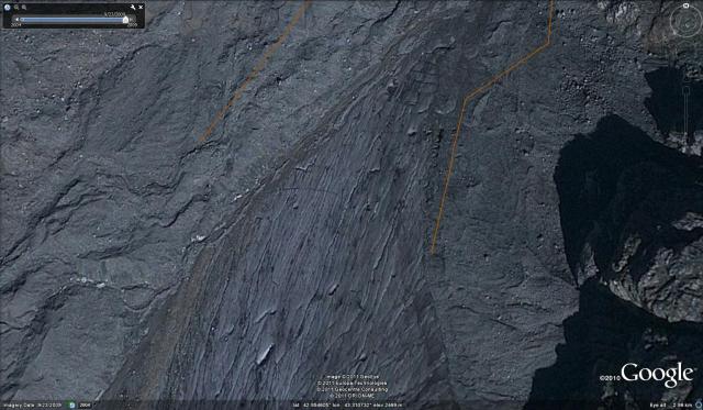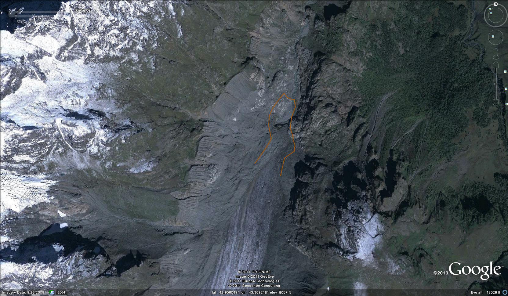 Google Earth provides two excellent views of the lower glacier from September 2006 (top image below) and September, 2009 (bottom image). In this three year interval the terminus of the glacier has retreated 450 meters. In 2006 a debris stagnant terminus area exists, that entirely melted away in three years.