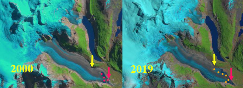 Benito Glacier in 2000 and 2021 Landsat images. Locations 1-6 are current or former distributary terminus locations. Red arrow is the 2000 terminus location and yellow arrow the 2021 terminus location. A small cloud is obscuring an iceberg near terminus. Purple dots are the snowline.