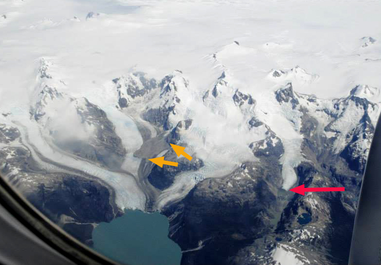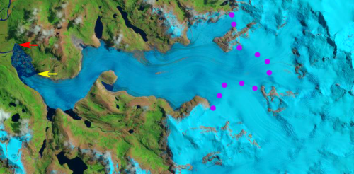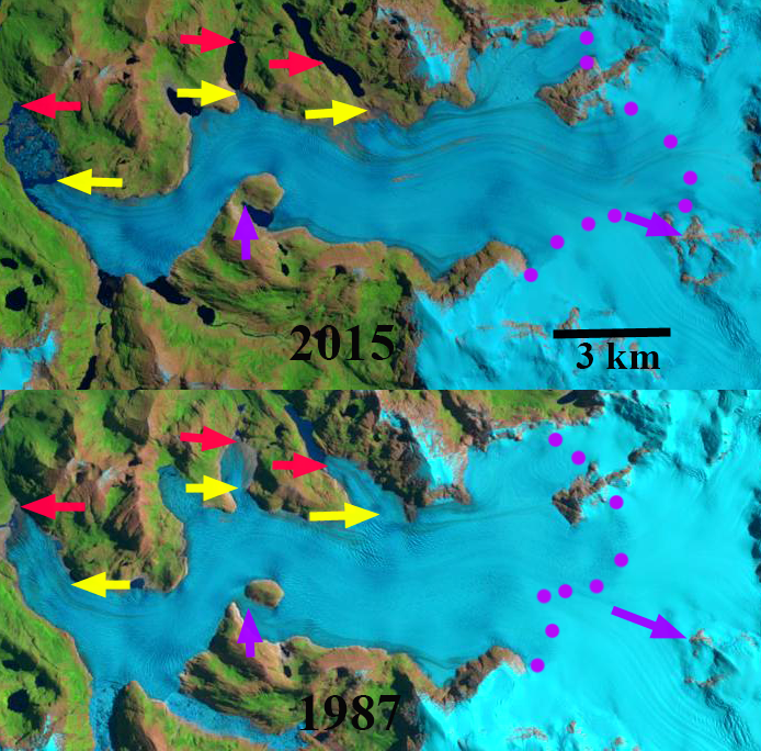 Benito Glacier comparison in Landsat images from 1987 and 2015 indicating the terminus position in 1987 red arrows, yellow arrows the 2015 terminus positions. Locations 1-6 are current or former distributary terminus locations. purple arrows where glacier thinning is expanding bedrock areas. The snowline is indicated by purple dots