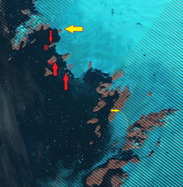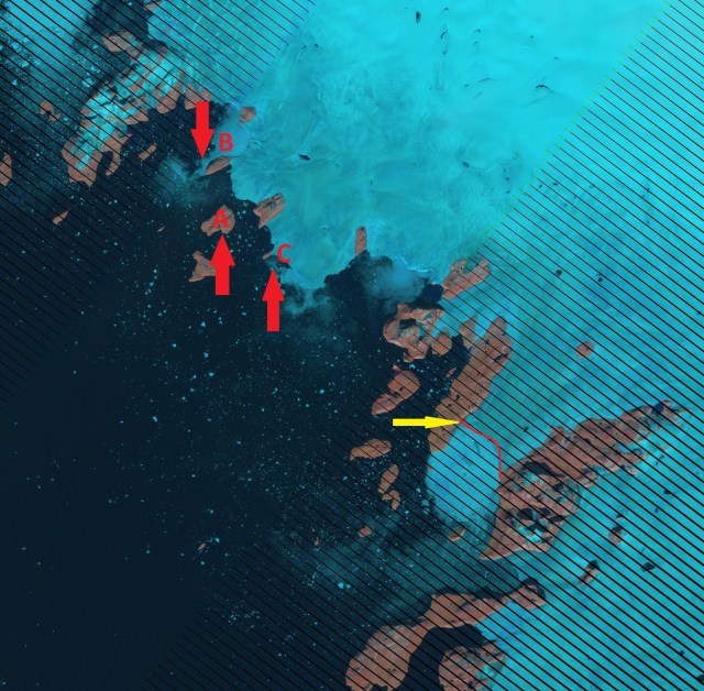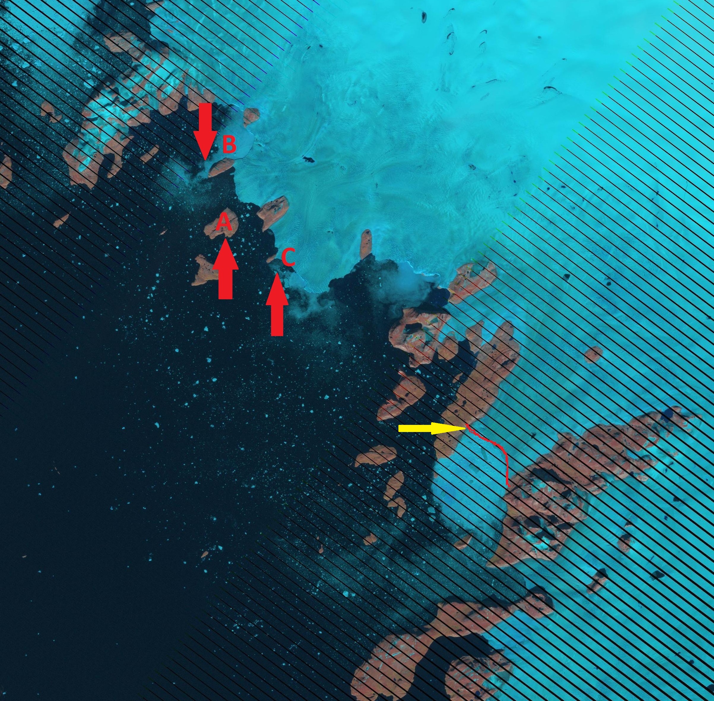 Here we examine Landsat images from 1999, 2001 and 2013 to identify changes. The red arrow indicates Red Head, which the glacier still reaches in 1999, though the connection is less than 2 km wide. The purple arrow indicates a small nunatak where the Automatic Weather Station utilized by Van As (2010) is located. The nunatak is 1.5 km from the ice edge in 1999. The orange arrow is an island at the ice front, South of the island the ice front is even with the island in 1999. The yellow arrow notes the connection of Steenstrup Glacier to Cape Seddon that is about 4 km wide. In 2001 there is little change in the ice front except at the purple arrow, where retreat has almost brought the nunatak to the terminus. By 2013 the connection to Red Head has been lost, it is now an island, this occurred as noted by Van As (2010) in 2005. Retreat from Red Head is 6 km. There is a substantial embayment south of the island at the orange arrow, indicating 4 km of retreat. North of this island that will soon lose it connection to the ice sheet, the embayment has expanded as well. At the purple arrow the ice front has reached the former nunatak now becoming an island. At the yellow arrow the loss in ice area at Cape Sneddon is greater than at Red head, though a connection may still exist, it is too narrow to measure. The last image below is a 2012 Google Earth image indicating the narrow connection to Cape Sneddon at that time and the strange relict crevasse pattern. It is clear that the end of Cape Sneddon will be in island next summer if not already, the MODIS imagery is not clear enough to distinguish this. The connection to the island at the south end of Kjer Glacier, last yellow dot near bottom has become much narrower since 1999 and will follow the route of Red Head and Cape Sneddon. The retreat here is coincident with the thinning and acceleration and follows the pattern of retreat and new island generation seen at Kong Oscar Glacier, Alison Glacier and Upernavik Glacier.