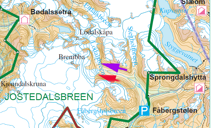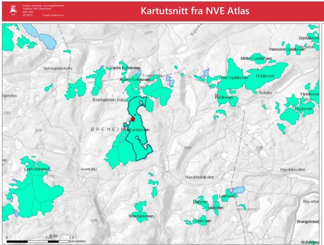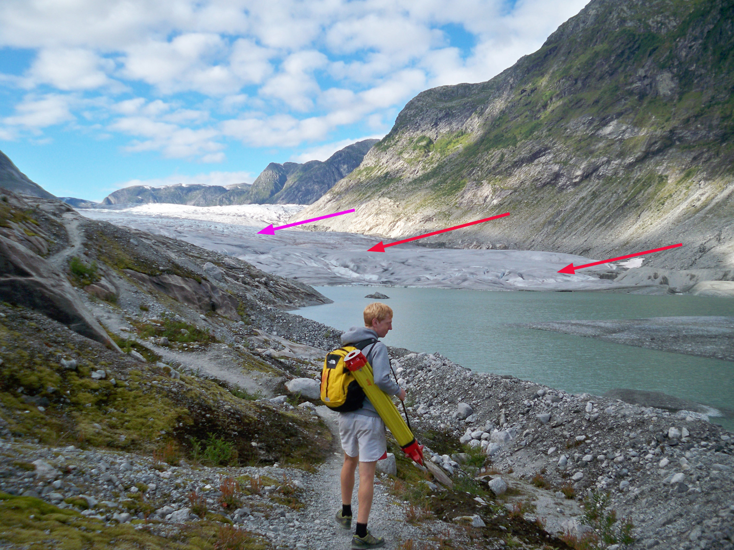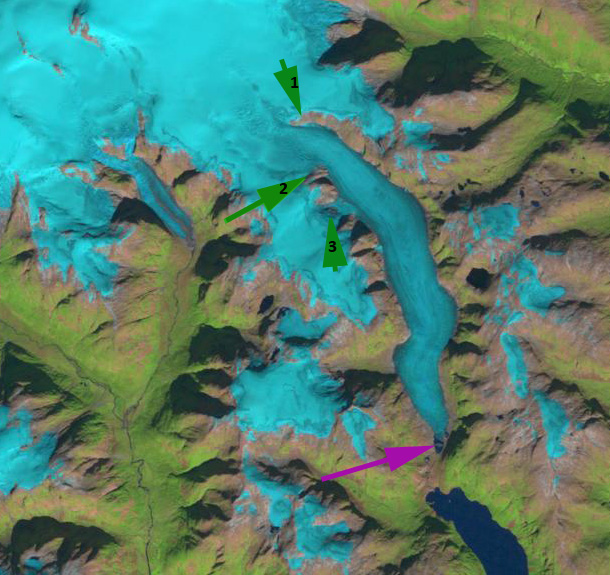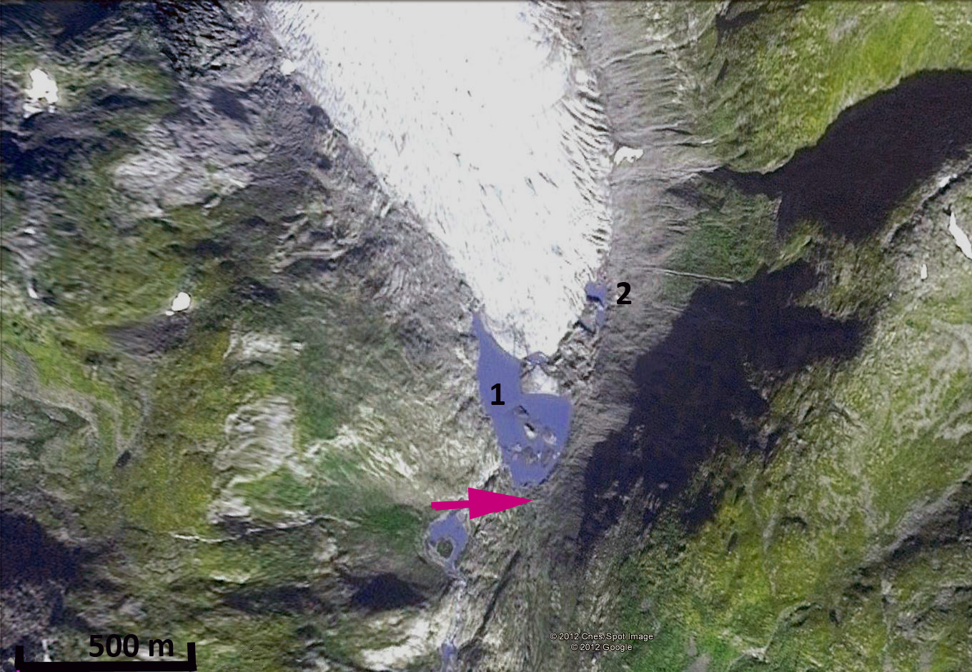 In 1990 the glacier terminated in the proglacial lake that was ~3.5 km long. There were significant feeders from the ice cap both north and south of the terminus tongue, pink arrows. In 1999 the glacier has retreated several hundred meters, still terminates in the lake and is still connected to the ice cap at the three noted locations, pink arrows. By 2014 the glacier has retreated out of the lake and has lost the two eastern connections from the ice cap to the terminus tongue. There is not retained snowcover on the valley tongue of the glacier. By 2018 the glacier has retreated 1400 m from the 1990 position, has only one narrow connection to the main ice cap to the north and has very limited retained snowpack even on 8/6/2018. There will be continued large mass balance loss for this glacier in 2018 reflective of the warm melt season in Norway. Once the glacier connection entering from the northwest is lost the glacier will have a limited accumulation zone. The retreat of this glacier is greater given the size of the glacier than at two other key glaciers of the ice cap, Engabreen and Storglombreen.