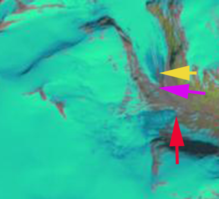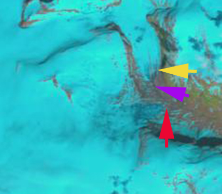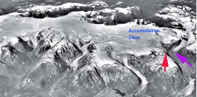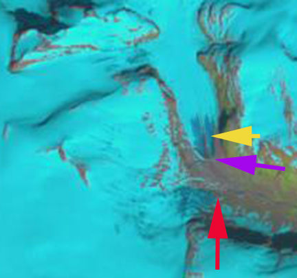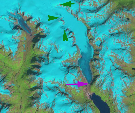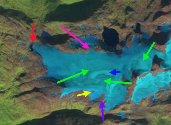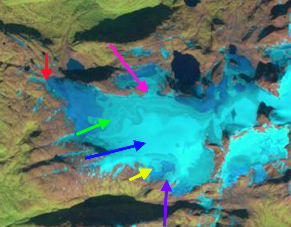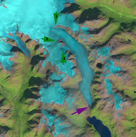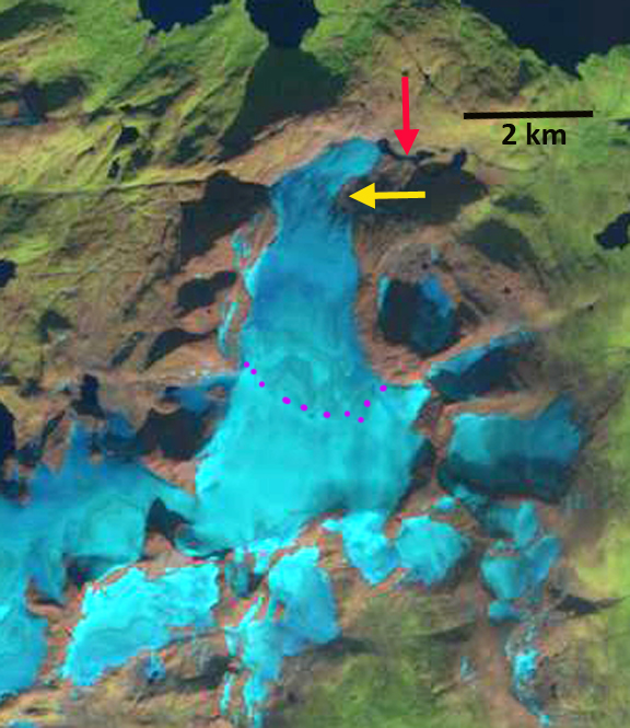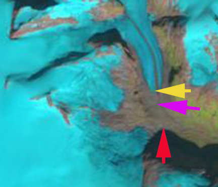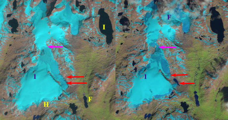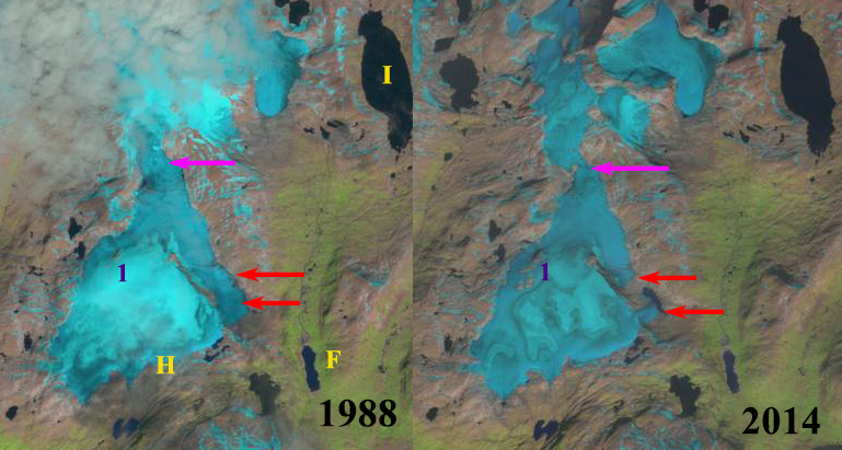 Flatisen Glacier in Landsat images from 1990 and 2018. The glacier terminates in the proglacial lake in 1990 at the red arrow and in 2018 at the yellow arrow no longer terminating in the lake. The pink arrows indicate three connections of the ice cap to the terminus tongue in 1990, with two lost by 2018.
