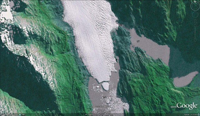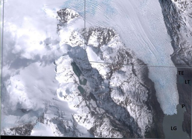 Map from GLIMS of the glacier divide of Upsala and Viedma Glacier with contours in meters noted.