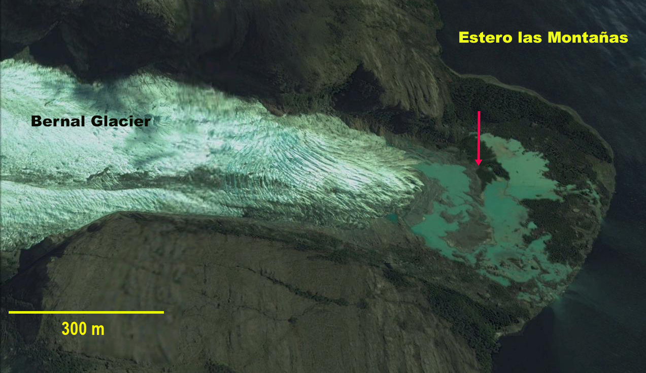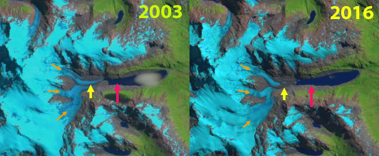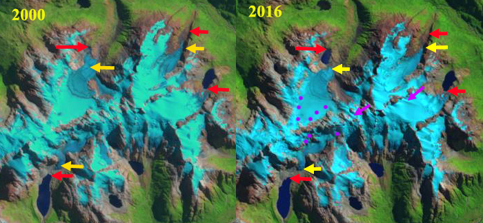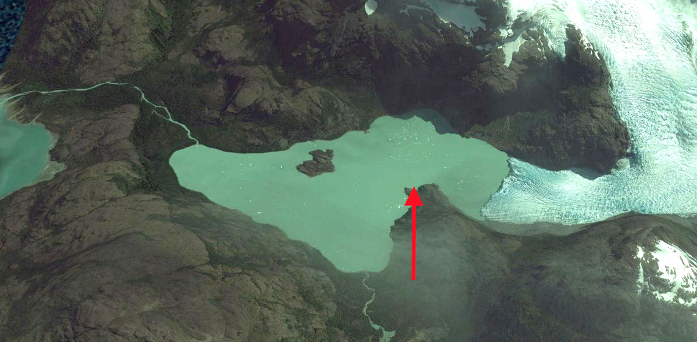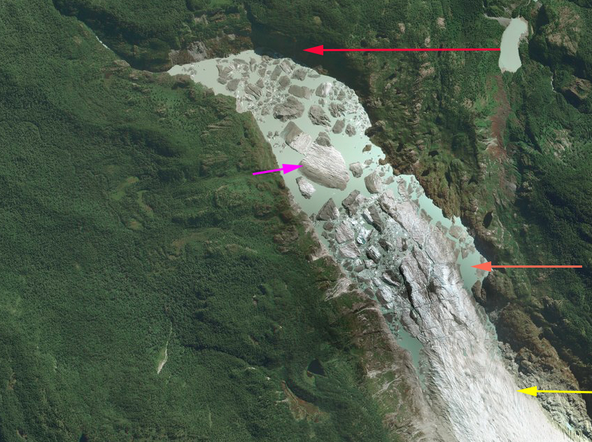 Exploradores Glacier is an northern outlet glacier of the Northern Patagonia Icefield. In 2016 Exploradores Glacier had a 12 km2 terminus lobe with a couple of small proglacial lakes with a total area of ~1 km2. The terminus lobe of the Exploradores Glacier is now collapsing, this is a process that has already occurred at Steffen Glacier, San Quintin Glacier and Colonia Glacier. The terminus lobe is relatively stagnant as indicated by the minimal surface slope. The result will be a new substantial proglacial lake. In 2023 and 2024 an active zone of calving has developed on the east side of the terminus, yellow dots, with an area of 2.1 km2. This appears ready to continue expanding west across the glacier tongue expanding this embayment.
