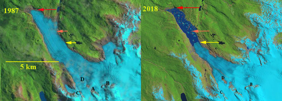 Reichert Glacier is an outlet glacier of the Northern Patagonia Icefied that retreated 6.7 km from 1987-2015. Then was nearly stationary to 2023, with a 750 m retreat from 2022 to 2024 and an active calving period spring 2024 note new icebergs in the lake. The terminus is retreating into a narrower fjord reach,, with a pinch point 1.5 km behind the terminus, that should provide short term stability.
