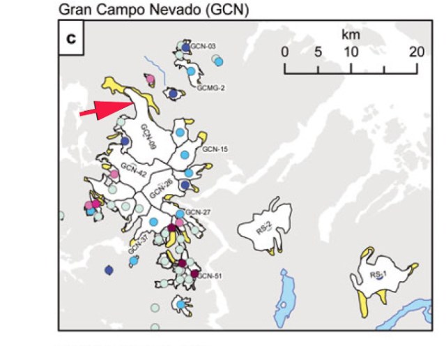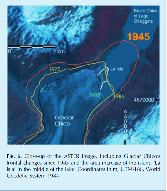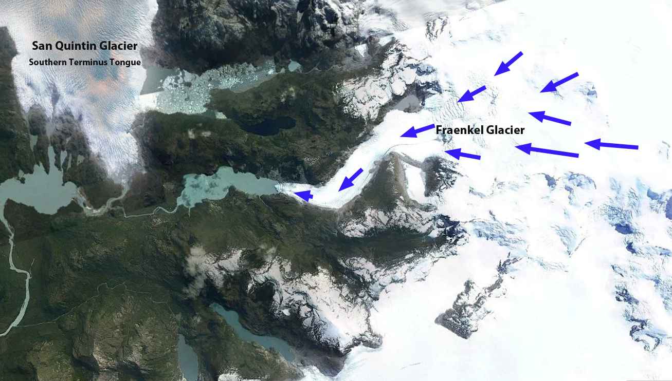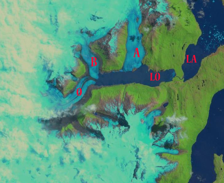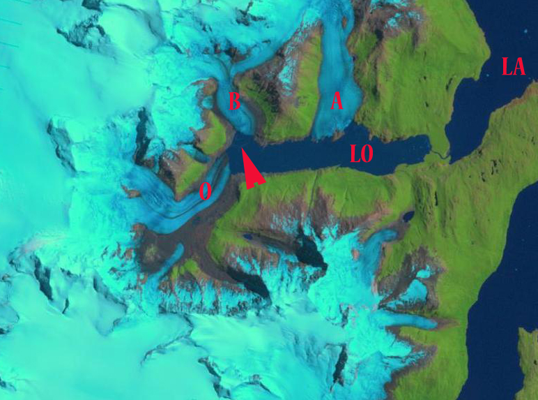 RG150 is a 3.5 km long glacier in Bernardo O’Higgins National Park on the western edge of the Southern Patagonia Icefield, Chile. RG150 is an unnamed glacier given this designation as part of the Randolph Glacier Inventory. The glacier terminates in a lake that drains into Seno Andrew. Willis et al (2012) observed that between February 2000 and March 2012 that the Southern Patagonia Icefield is rapidly losing volume and that thinning extends even to high elevations. The mass balance loss is occurring at a rate of −20.0 ± Gt/year, which is +0.055 mm/year of sea level rise. The retreat has been driven by increasing calving rates from the 1975-2000 to the 2000-10 period (Schaefer et al, 2015). The pattern of retreat is consistent between these glaciers and the region as noted by Davies and Glasser (2012), annual rates of shrinkage in the Patagonian Andes increased in from 0.10% year from 1870-1986, 0.14% year from 1986-2001, and 0.22% year from 2001-2011. Davies and Glasser (2012), note the all the glaciers in the complex inclusive of RG150 had their fastest retreat period from 2001-2015. Glasser et al (2016) observed both an increase in glacier proximal lakes and in debris cover on glaciers with glacier retreat from 1987-2015. These losses have led to retreat such as at Balmaceda Glacier, Glaciar Marconi and Glacier Onelli. Here we examine Landsat imagery from 1984 to 2015 to identify glacier change and the formation of a new lake.